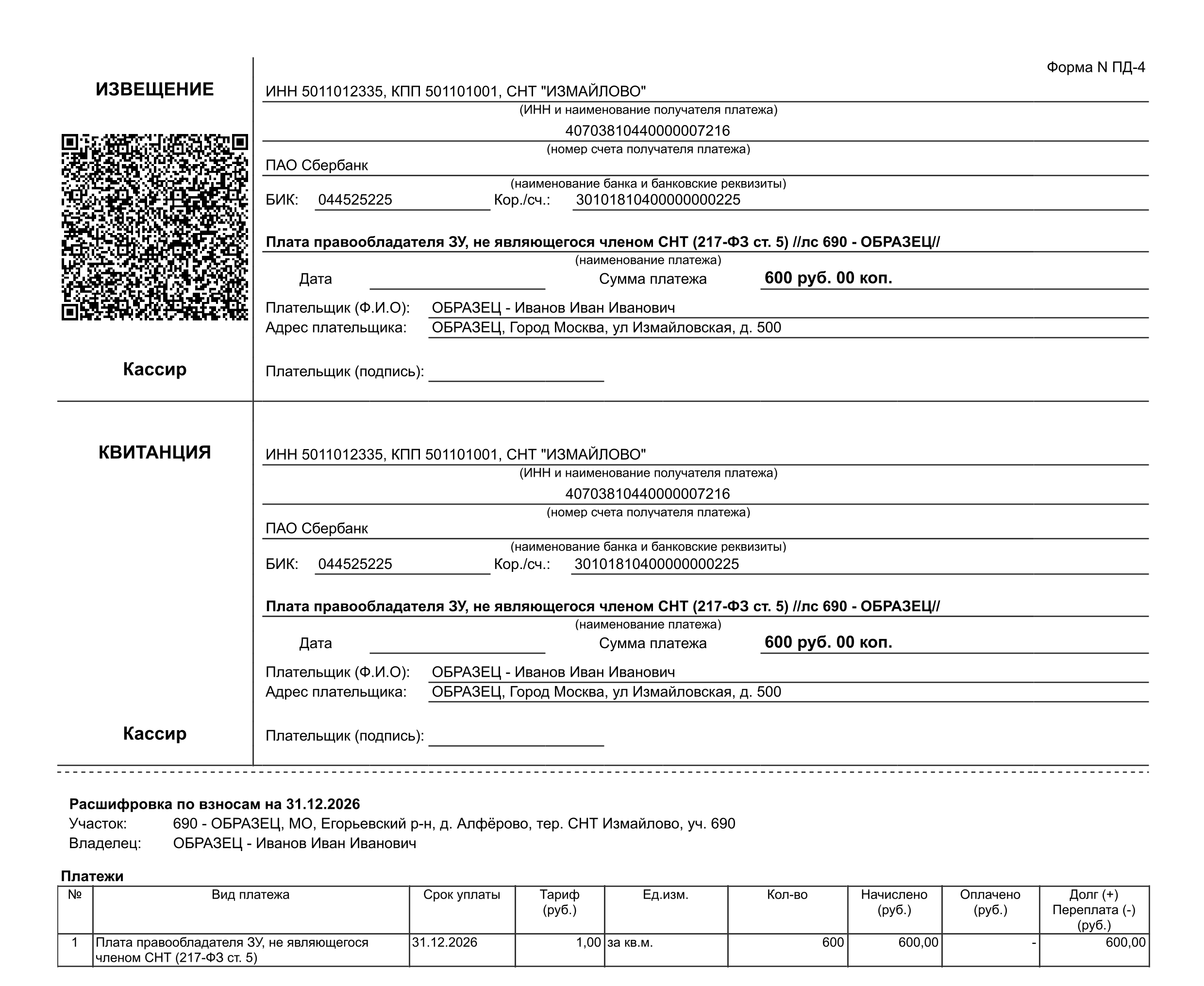 ОБРАЗЕЦ КВИТАНЦИИ - плата (для индивидуалов / не членов СНТ)
