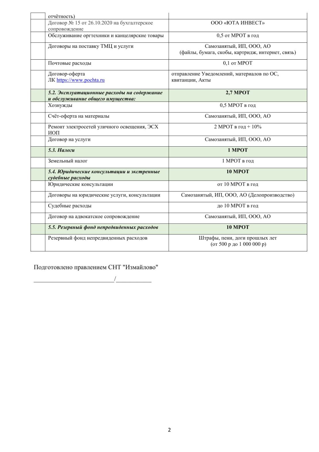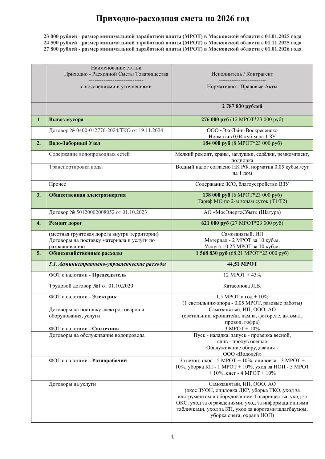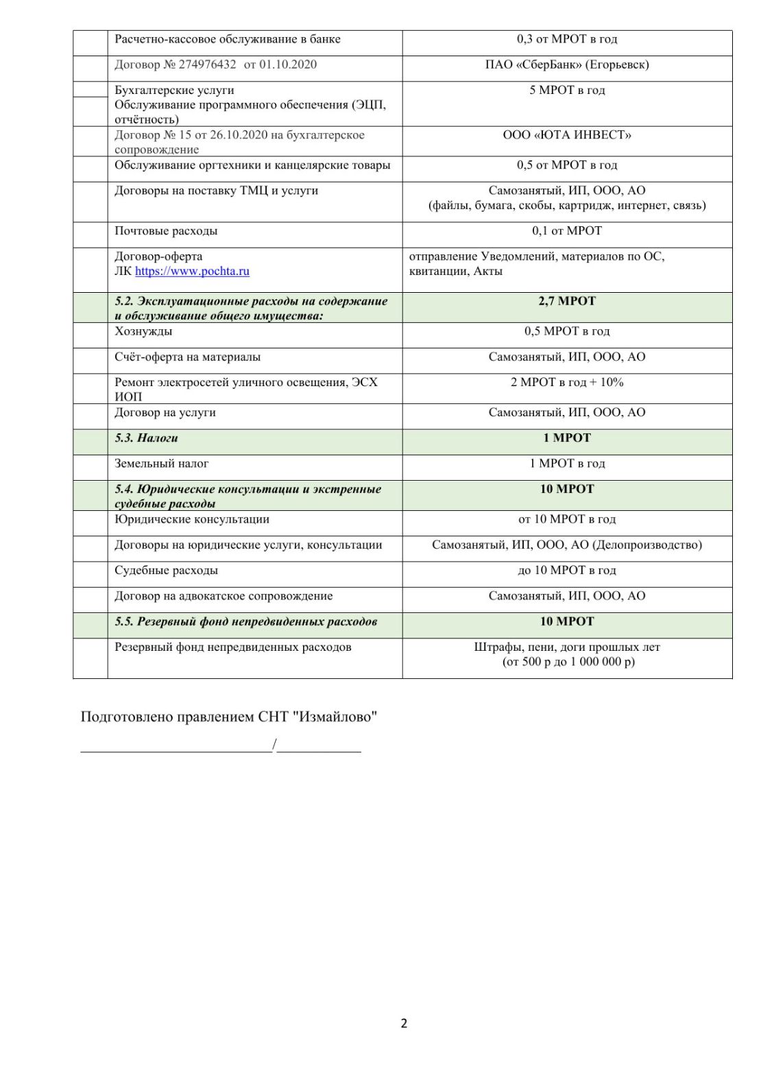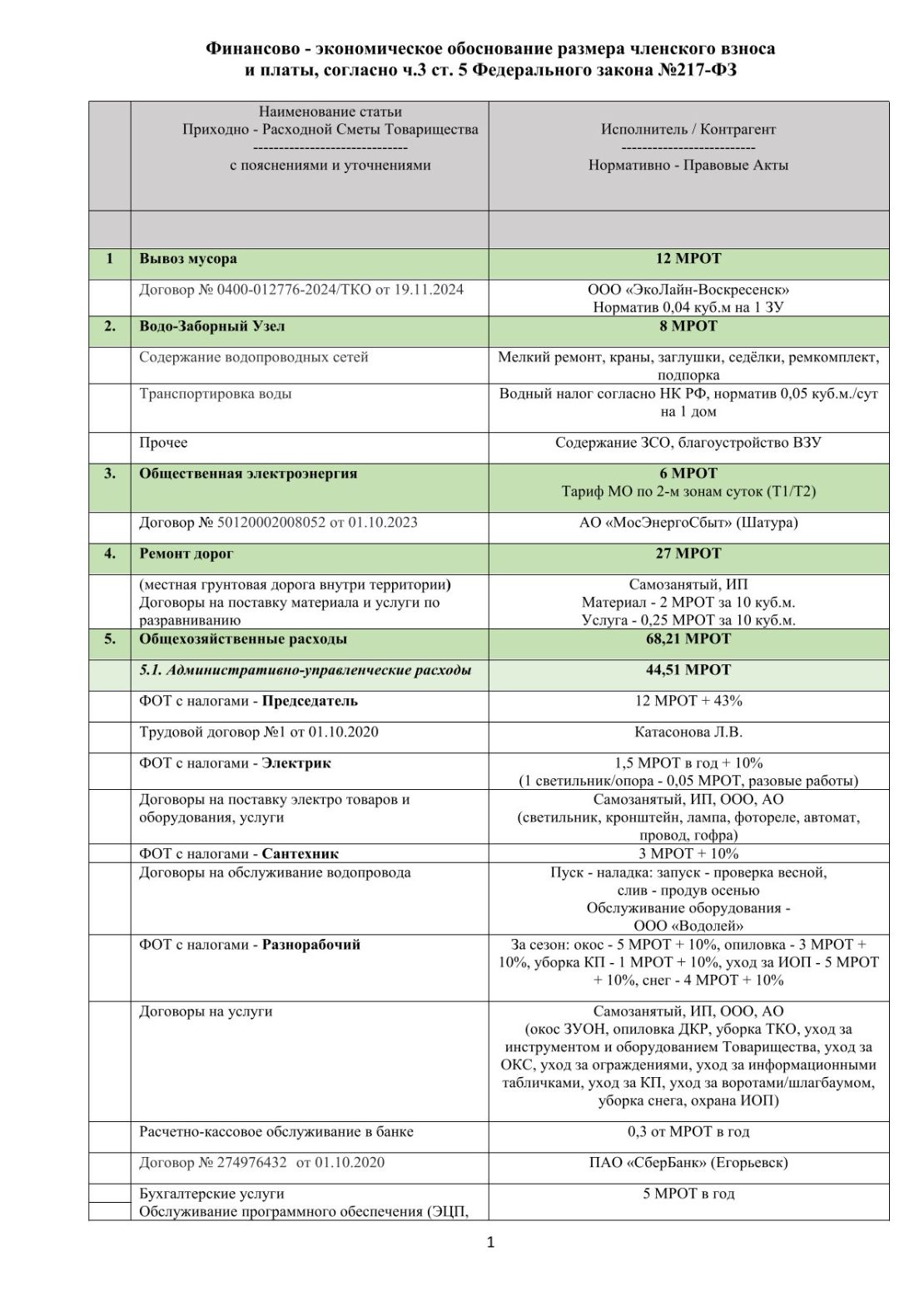 Приходно-расходная смета товарищества на календарный год (с 01 января по 31 декабря)